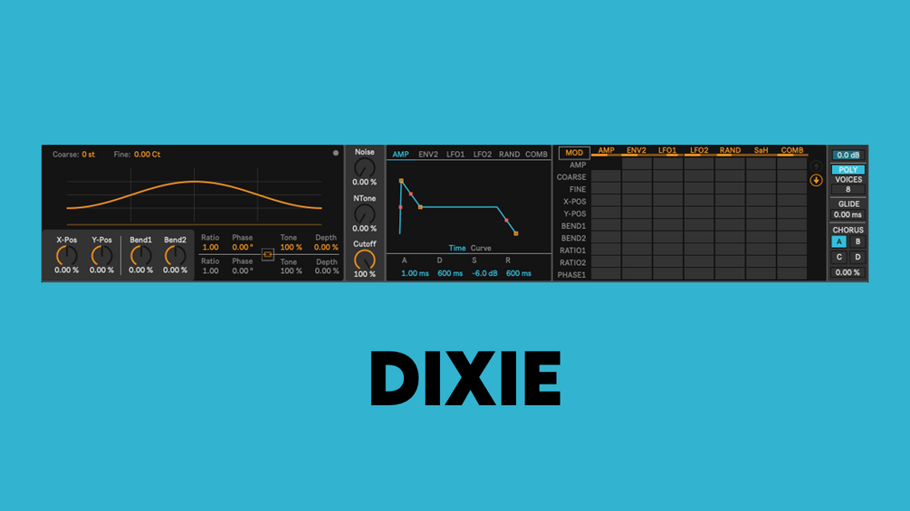 Dive into a new realm of sound design with Dixie, a powerful Max for Live synthesiser built with a brand-new synthesis method combing Phase Distortion and Phase Modulation called Wave Pulse Phase Modulation(WPPM for short). This offers a fresh approach to creating unique expressive, complex tones. This synth is also fully MPE-enabled, allowing you to explore a new dimension of gestural control in your presets.